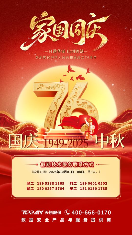 在这个万家灯火、共赏明月的美好时节,天锐绿盾祝愿伟大祖国繁荣昌盛、国泰民安!祝全体客户、合作伙伴和朋友们国庆快乐、阖家幸福、万事如意!